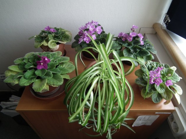 Még a váci úti irodánkban ültünk, mikor az első fokföldi ibolyák érkeztek, több mint 3 évvel ezelőtt. Egy halványlila-fehér, egy kékes lila, és egy sötétlila. azóta egyre jobban elburjánzanak. Nem kapnak mást, csak csapvizet, és rengeteg fényt. És szépek. Látszik rajtuk, hogy jól érzik magukat, de csak a halványlila szaporodik. Próbálkoztunk a többivel is de ők nem együttműködők. Ez megfejthetetlen. :-)