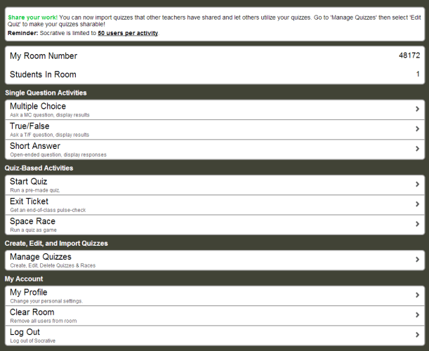 Az ingyenesen elérhető online eszközök között a Socrative oldal kvízek, kérdéssorok összeállítását, és a kitöltés, a megoldás menedzselését biztosítja számunkra. Tanárként jól használhatjuk gyakoroltatásra, a tudásszint felmérésre, akár számonkérésre is, illetve előkészítés nélkül is feltehetünk szóban kérdéseket, a válaszokat pedig, amit a diákok számítógép, vagy más interneteeléréssel rendelkező eszközzel, például okostelefonnal adnak, azonnal láthatjuk. Használata egyszerű, sem a tanártól, sem a diákoktól nem igényel különösebb előismeretet. Az oldal angol nyelvű ugyan, de a menükben található néhány kifejezés könnyen megérthető, gyorsan megtanulható a használat nyelvtudás nélkül is.