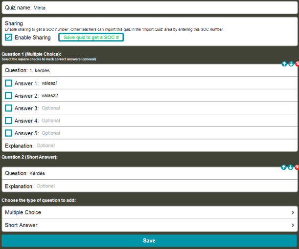Két kérdéstípus létezik a Multiple Choice, a feleletválasztás – ezzel valósíthatjuk meg az igaz-hamis típusú kérdést is, és a Short Answer (szöveges válasz). Ezekből tetszőleges számút illeszthetünk egymás után.