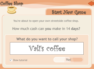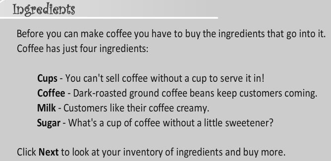 A játékban egy kávézót üzemeltet a játékos, 14 napon keresztül. Cél nyilván a minnél nagyobb bevétel elérése. Egy alapösszeg birtokában a játékos maga gazdálkodik. Megvásárolja a hozzávalókat, összeállítja a receptet, meghatározza az árat, és igyekszik a naponta változó, megadott feltételek szerint a legjobban kiszolgálni a vendégeket. Az összetevők 10, 20, 50 db-os kiszerelésben elérhetők, a tej, mivel megromlik naponta újra beszerzendő, az időjárási viszonyok meghatározzák, hogy a járókelők mennyire édes, vagy krémes kávét szeretnek. Az egyértelműen megadott feltételek alapján naponta újra kell vásárolni, újra kell tervezni a gazdaságos működéshez az összetételt és az árat. A vásárlók véleményei és a napi zárások után megjelenő eredmények, grafikonok segítenek a tervezésben.