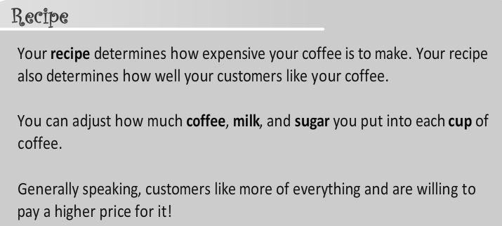 A recepted meghatározza, hogy milyen drága a kávé, amit készíthetsz, és azt is, hogy mennyire szeretik a vásárlók. Megadhatod, hogy mennyi kávé, tej és cukor legyen egy bögrében. A vásárlók azt szeretik, ha a kávéban mindenből sok van, és hajlandók ezért magasabb árat fizetni.