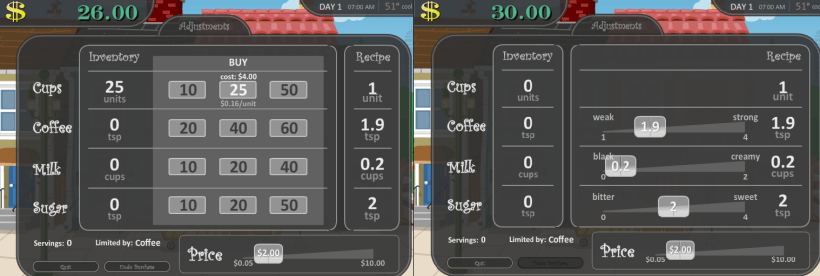 Ezután új nap kezdődik, ismét vásárolhatsz, beállíthatod a másnapi kávé receptjét figyelembe véve a z időjárás előrejelzést, és a vásárlók szokásait.