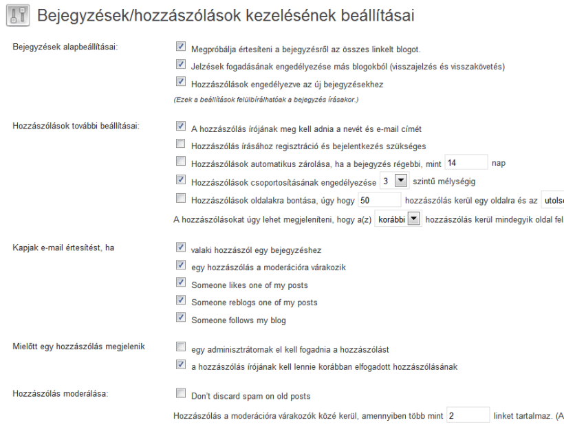 Blogunk bejegyzéseihez és oldalaihoz a látogatók kommenteket adhatnak. A hozzászólások alapértelmezésben nem jelennek meg automatikusan a  posztok alatt, csak ha jóváhagyjuk azokat. Így szerzőként lehetőségünk van moderálásra. A kommentek listájának oldalsávra helyezését is megtehetjük, az arra alkalmas widget használatával.