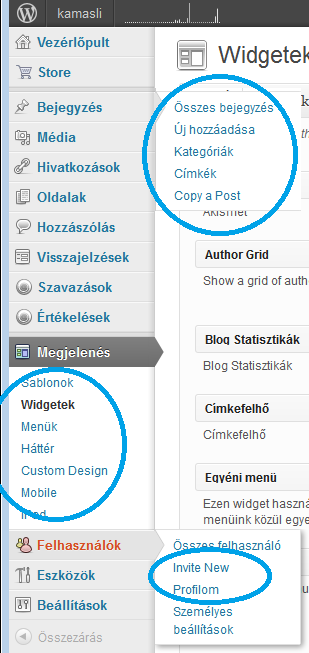 A megjelenés menüből elérhető widget – minialkalmazás – készlet elemei a blogunk oldalsávjában helyezhetők el. (Az oldalsávokat, a lábléceket a sablon választása is meghatározza.) Vonszolással húzhatók egyenként az oldalsávba. A szerkezetüktől függően lehetséges, hogy egyéb beállításokat is kell tennünk, melyek a megjelenítést befolyásolják. Néhány közülük önálló elem, mint a naptár, vannak azon olyanok, melyek saját webhelyünk elemeire mutatnak, ezeket előzőleg ott kell szerkeszteni. Ilyenek a címkék, kategóriák, a felhasználók névjegyei, képek, a saját oldalak, a linkek, saját menük. Az oldalsávban külső linkek elhelyezése a hivatkozás widget oldalsávra húzásával lehetséges. Ennek elmentése után azok a linkek lesznek láthatók, melyeket hivatkozások között a rendszer előre elhelyezett (ezek törölhetők), illetve amiket mi előzőleg a hivatkozások közé felvettünk.