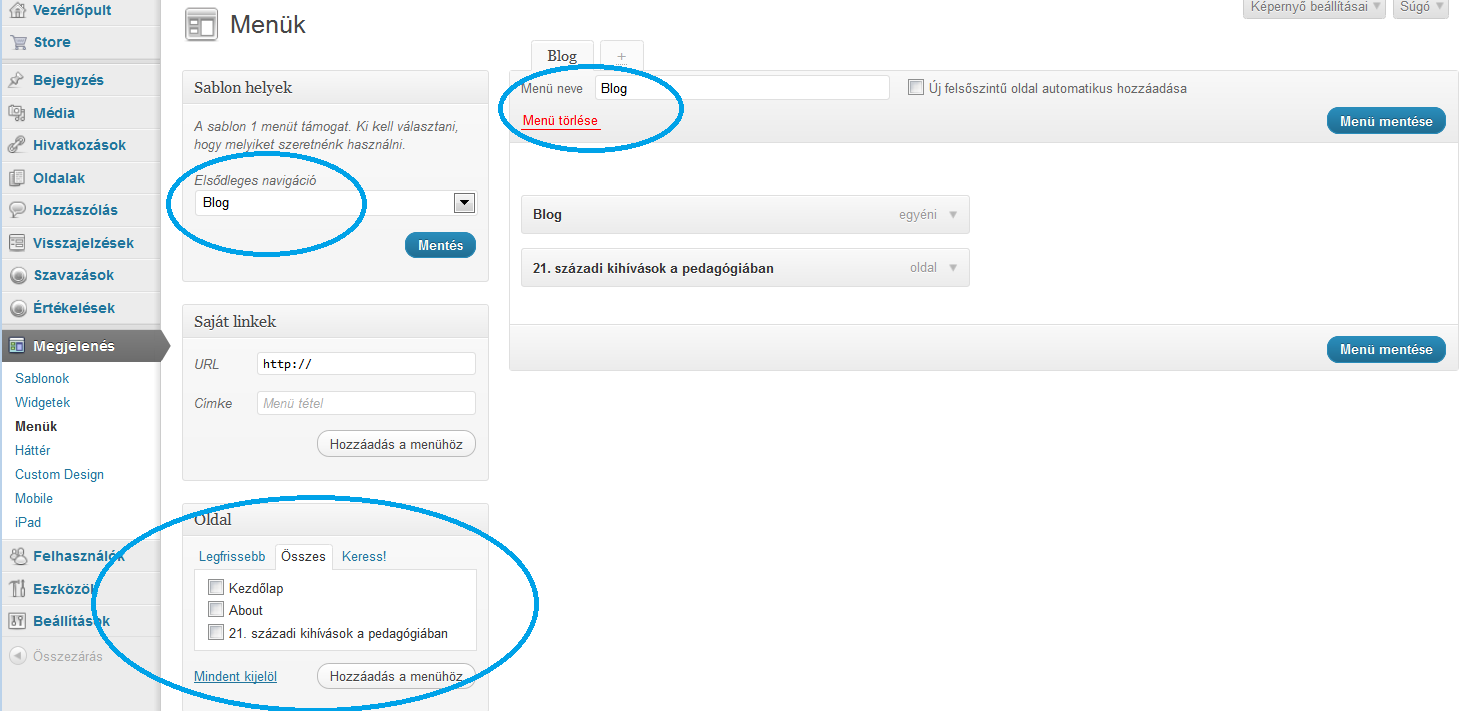A legtöbb sablon tartalmazza a menü elhelyezésnek lehetőségét. Új menü létrehozásakor nevet kell adnunk neki, és ki kell választani a lapok közül azokat, melyeket a menü elemeiként szeretnénk megjeleníteni. Ezen kívül fontos, hogy beállítsuk az elsődleges navigáció melyik menüt jelenti.